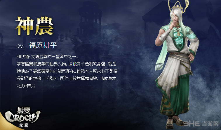掌管医药和农业的仙界人物,据说其半透明的身体,就是特地为了确认药草的效能而存在。虽然本人原来并不是擅长战斗的性格,不过为了同伴而毅然挥舞赭鞭,借助草木之力作战。