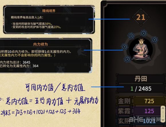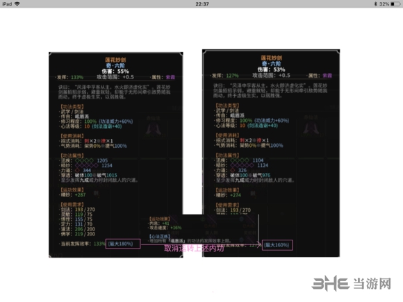 紫色框里牵引过去的部分,那部分是**数字,数字越高伤害越高,不同的武功见也可以对比!而且是这个功法经过上述一系列影响之后的**数据!