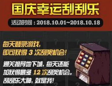 10月1日-10月18日活动期间,玩家挑战推荐地下城、登录、累计挑战地下城次数可获得刮奖机会。