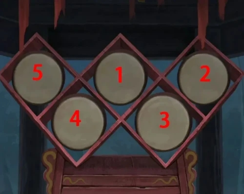 17、之后按下图调整排位顺序,回到敲鼓的位置,使用朱砂笔解开罐子上的封印。