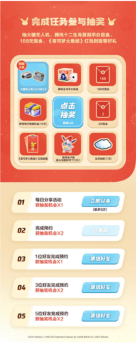 没有领到的训练家也不要着急!完成预约即可获得2次**机会,还可以通过分享活动页面、集结好友参与预约来积累**次数,不**机会抽到《宝可梦大集结》专属红包封面,更有可能抽到无人机、188元现金红包、生肖手办盲盒、道具奖励等新年豪礼哦。分享**,机会更多!
