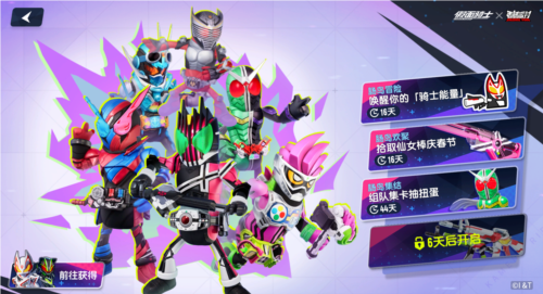 联动活动正式上线后,登录即可免费领取一个假面骑士梦幻补给箱,抽取创骑、艾克赛德等骑士的皮肤套装,另有更多骑士变身动作等你解锁!更别提与联动同步开启的新活动【肠岛集结:组队集卡抽扭蛋】,只需在活动期间内组队完成指定任务,即可兑换积分进行转盘抽卡,免费获得更多奖励!