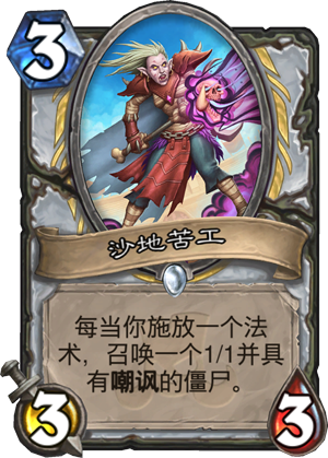 沙地苦工,牧师3费随从卡,33身材,常规身材,每当你施放一个法术,召唤一个1/1并具有嘲讽的僵尸。