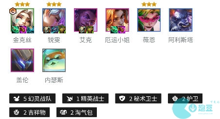 2、阵容羁绊:5幻灵战队、1精英战士、2秘术卫士、2吉祥物、2淘气包