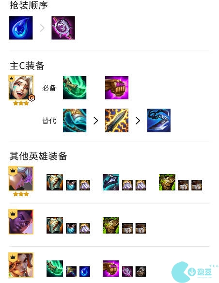 (2)开局时,优先合成眼泪和大棒,然后尽可能早地合成电刀或青龙刀。法术爆发能力不是幻灵战队的强项,因此前排应该优先装备抗性装备,板甲是性价比**的选择。在前期,可以合成日炎来过渡。瑞文可以在后期三星后**装,而把肉装换给艾克,因为自己的装备可以捡破烂。