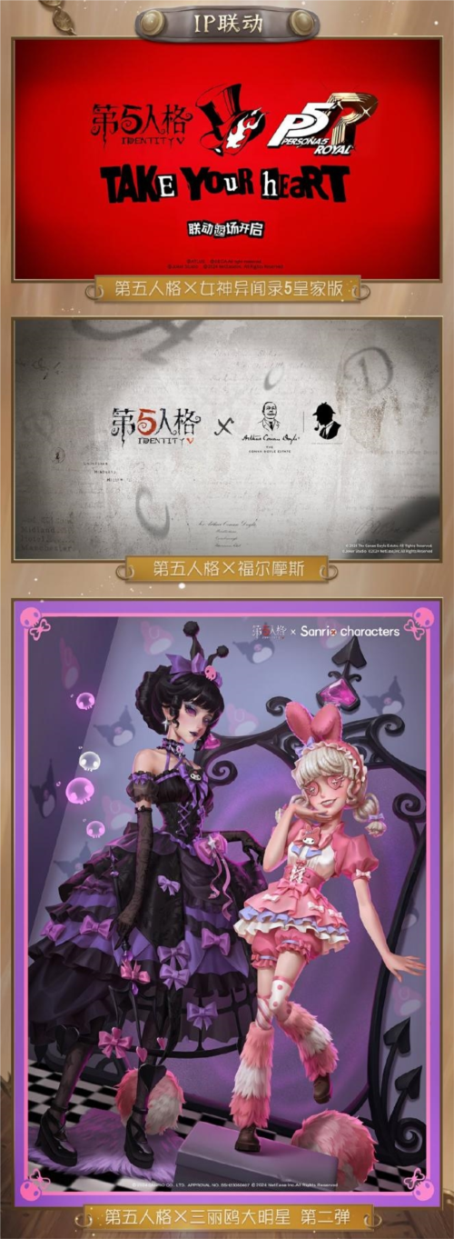 熟悉的联动元素也将再次在庄园中亮相。三丽鸥大明星联动第二弹即将开启,红夫人、拉拉队员换上新装,期待着各位访客的到来;《第五人格》与女神异闻录5皇家版联动在即,再次集结后的返场将分为两次联动活动和大家见面!《第五人格》×福尔摩斯Sherlock Holmes联动决定,**侦探**现身欧利蒂丝庄园,下一站,贝克街 221B,真相等待揭开.......