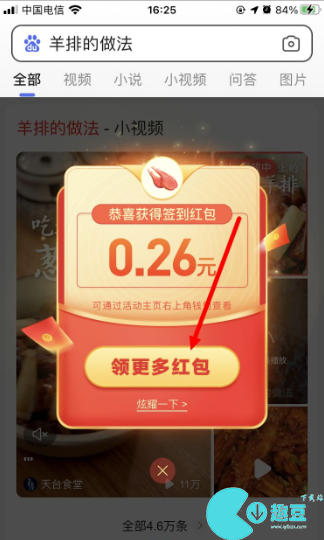 4、获得签到红包后,还可以点击“领更多红包”返回活动页面,搜索更多内容领更多红包;
