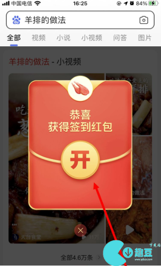 3、成功搜索指定的内容后,将会弹出签到红包,点击“开”即可领取签到红包;