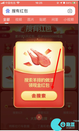 2、进入活动之后,将会有签到弹窗弹出,点击“去搜索”;