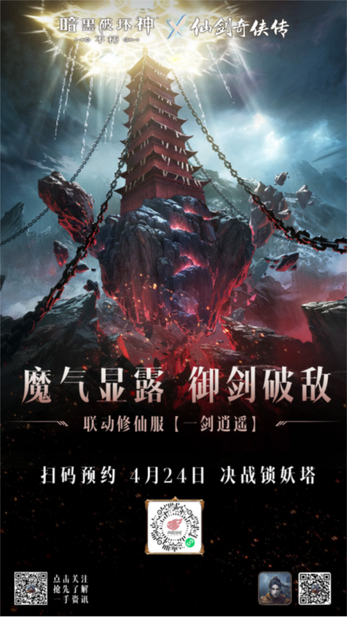 侠肝义胆,斩妖除魔,锁妖塔一战定乾坤!《暗黑**神:不朽》×《仙剑奇侠传》联动版本将于4月24日正式上线,届时玩家将化身剑仙“李逍遥”在锁妖塔内与拜月教主展开激烈交锋,一代大侠的传奇故事将由你来续写!