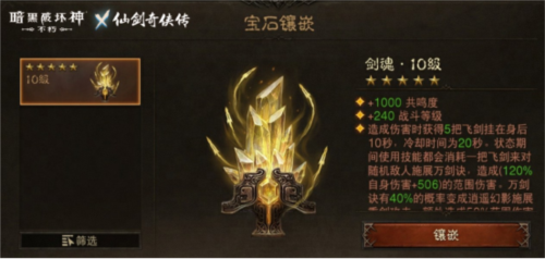 逍遥凝幻影,剑啸动天地!玩家携带仙剑联动传奇宝石【剑魂】后,即可施展蜀山仙术——万剑诀。使用者对敌人造成伤害时,将会获得5把悬挂在身后的飞剑。其后每次使用技能,均会施展万剑诀随机锁定一名敌人,消耗已召唤的一把飞剑发起自动攻击,瞬间对其造成强劲的爆发伤害。此外,宝石**提升后,万剑诀概率触发专属机制,唤出逍遥幻影,引动九天灵力降下重剑一击,对敌人造成额外范围伤害和击飞效果,利剑出鞘,究极必杀。