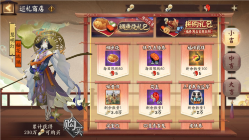 使用收集的「福运泡泡」在巡礼商店中兑换SR阶式神慧明灯皮肤「拈花琉璃」、动态头像框「澄澈华年·莫逆」、活动专属插画、御行达摩、SSR/SP式神召唤券、**结界卡等奖励。