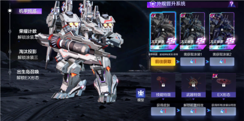 使用新版外观晋升系统的对应外观,拥有了SS外观后,即可花费1张闪卡解锁涂装1或技能**,后续可继续花费1张闪卡解锁涂装2或武器**。而**在武器**与涂装2共同解锁后,可花费1张闪卡解锁EX形态!