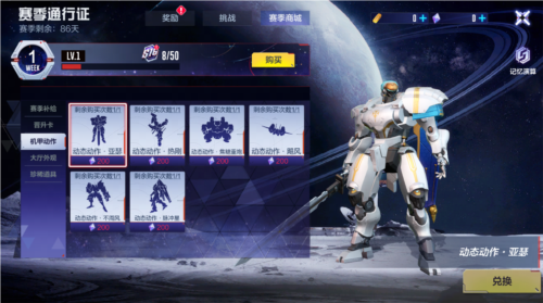 机甲动作:机甲独特的动态动作,拥有后可于藏品-个性化-机甲动作界面装配,装配后在局内变身机甲后即可通过表情轮盘触发播放