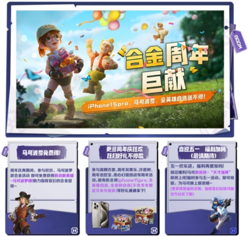 此外,只要参与合金一周年庆典专属活动,即能狂扫惊喜好礼不停歇!王者x合金联动新英雄-马可波罗,iPhone 15 Pro、全英雄自选、全皮肤自选(不含龙年限定艾米尔皮肤),等多重好礼等你带回家!