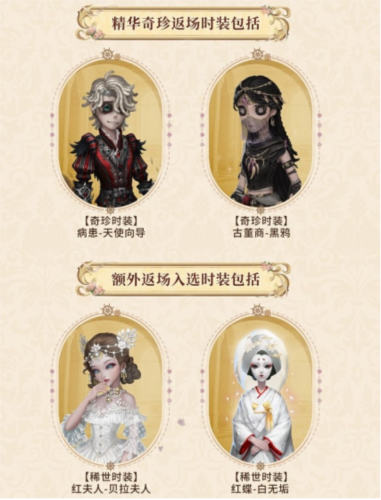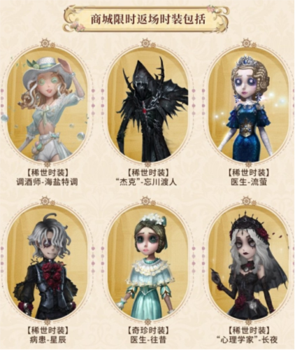 荣耀获选的时装为商城限时时装中的调酒师稀世时装-海盐特调、“杰克”稀世时装-忘川渡人、医生稀世时装-流萤、病患稀世时装-星辰、医生稀世时装-往昔、“心理学家”稀世时装-长夜,精华时装中的病患奇珍时装-天使向导和古董商奇珍时装-黑鸦,通过额外返场池返场的时装则为红夫人稀世时装-贝拉夫人和红蝶稀世时装-白无垢!