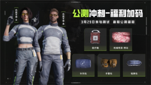 项目组在原有的预约千万玩家军需物资礼赠基础上还给游戏公测福利加码,参与此次公测冲刺阶段测试,即可获得机能军装、**喷漆、医疗箱等好礼。