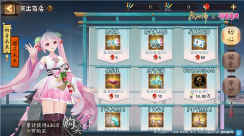 在活动中获得的「音援棒」,可在演出商店中兑换联动角色印花·自选、随机SSR/SP式神召唤券、御行达摩、神秘的符咒、活动限定插画、初音未来限定联动表情包、初音未来限定皮肤「樱花未来」以及动态头像框「镜音之遇·守护」 等奖励。