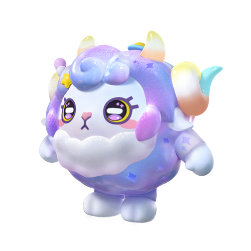 星云咩咩有着蓬松如云的毛发,清透而绚烂的蓝紫色如同宇宙里细碎闪烁的星光。渐变色的弯角如糖果一般晶莹可爱,每当她奔跑起来,身边的星云就会托着梦境一同漂浮,又随着毛发的飘散而飞向远方。因为害怕毛毛把周围淹没,她总是睁着水汪汪的大眼睛强打精神,心里却想着,“什么时候,才能睡个好觉呢?”