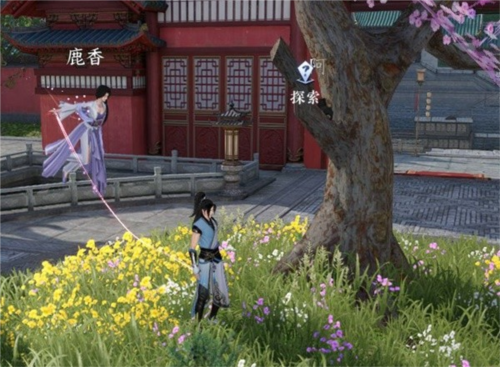然后跟着任务提示找到鹿香姑娘,对话完邀请她挂风筝,猫就在对面院子里的树上