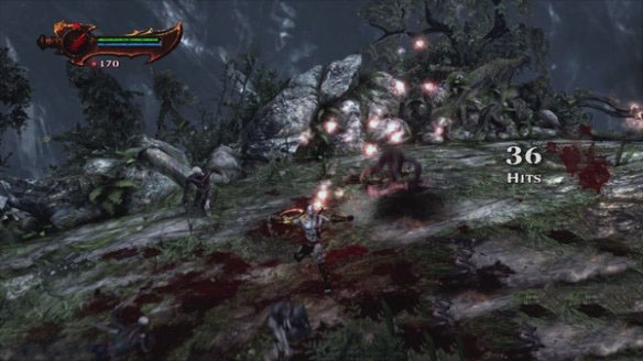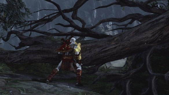 接着便是一段即时演算的动画,它向你展示了悲剧的海神**的光芒;完了之后又一一波杂兵,这一波依然是让你练手,例如按L2释放魔法,清理完毕之后向前,抬起阻挡在奎托斯面前的大树,继续向前。