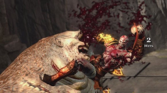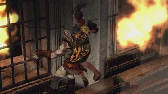 太阳神被击坠,回头利用鹰身女妖飞过大沟壑,清理完敌人之后打开左边的门拖出装满荆棘的炉子,然后打开右边的门,边走边推荆棘,荆棘用来解决面前的一大堆敌人会轻松很多,向右继续走,爬上墙的边缘,向前走会有一个平民阻挡你的去路,去解决掉他…非常的不人道。