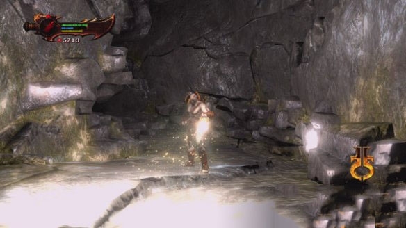 太阳神一死,乌云蔽日遮盖了太阳,整个奥林匹斯山都被笼罩在黑暗之下,获得“太阳神的头颅”,右方有“太阳神的护盾”(通关奖励,别忘了拿)然后走到石壁旁边按R2 右摇杆照亮整个屏幕即可推开大门继续前行,洞窟里面一片黑暗,需要合理的使用太阳神的头颅照明(持头颅状态按?射箭,弓箭状态按△来切回头颅)来清理敌人。