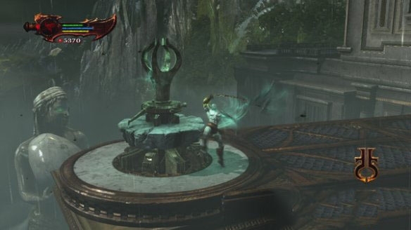 奎托斯捏碎了镶嵌在赫拉酒杯上的绿宝石一切回复到了自然,接着径直向前走到达悬崖边利用鹰身女妖通过,下来回复生命以及魔法存个档推动拉杆打开大门。