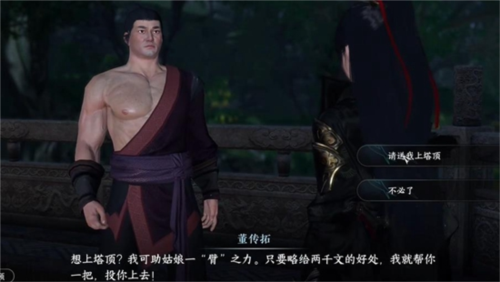2、然后和董传拓对话,给他两千文就能送你上塔顶。
