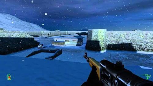 爬下梯子,打开右边的门,干掉里面的两个卫兵。穿过**,从另外一边的大门出去。走到拱形城门下,打死右边了望塔上的两个卫兵,再打死城门左右两边的两个卫兵。进入左边的地堡,搭电梯到地下。打开六角形的铁门进入管道。在管道另外一边的屋子里有两个卫兵,干掉他们。再打开对面的六角形铁门,进去以后一直往前走,**到了直升机机库。从梯子爬上右边的控制室,进门以后走到核弹头前。和总部通话之后,看到EKK搭直升机逃走,任务完成。