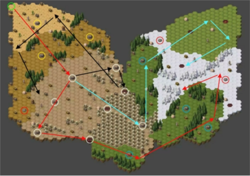 2、争夺排行榜核心思路依靠1队(红色箭头,后续简称1队),2队(蓝色箭头,后续简称2队),3队(黑色箭头,后续简称3队),以最快速度集齐8个“远征”主题徽章(白点);