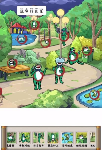 喝醉的青蛙是汉字找茬王中**上线的一个趣味关卡,在公园中有许多的喝醉后的青蛙,他们都在做着各种离谱的事情,玩家需要找出**青蛙才能过关,小编给大家带来汉字找茬王喝醉的青蛙通关攻略,一起来看看吧。