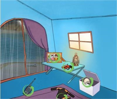 2、这个时候会进入到帐篷内我们找到如图:对讲机、潜水服、急救包、信号枪、合影、合影最左边女生的帽子。