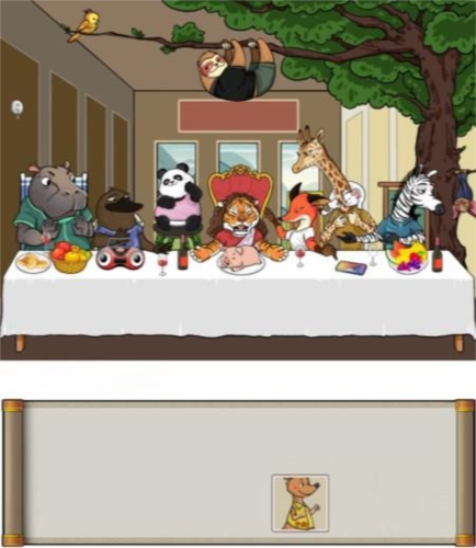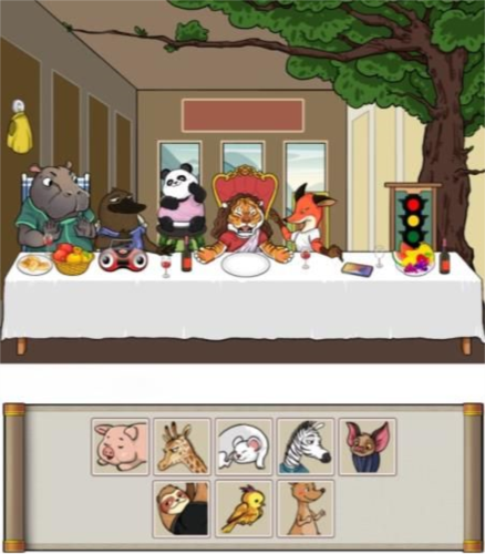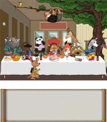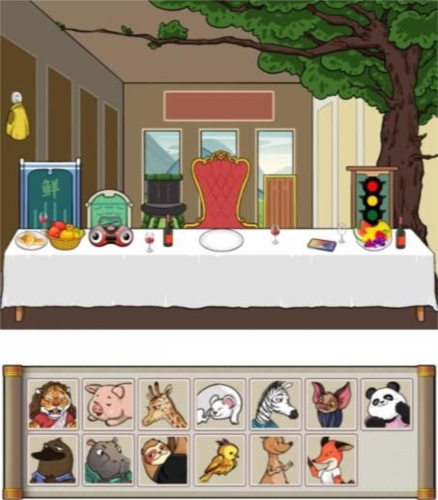 2、接下来我们 就要照顾下游戏中的这些小动物们了,树上小鸟还有树懒,还有餐桌上的烤乳猪它们都需要找到自己的位置;