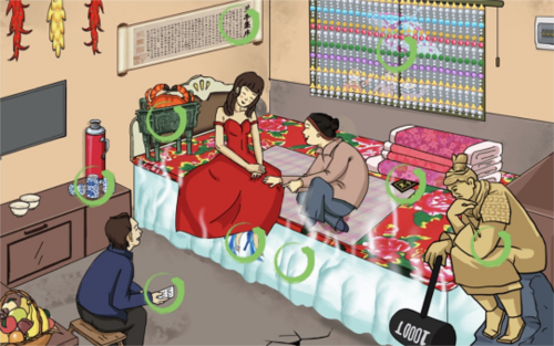 2、打开柜子可以找到【房产证】,使用锤子敲击裂缝地面,可以找到【石油】,下拉绳子打开窗帘,可以找到【外星飞船】,窗帘是【珠宝窗帘】,床尾有【思考者佣】,床头有【青铜鼎】,墙上挂着【兰亭集序】,被子下是【**】,蓝色衣服人手上的【名片】,新娘穿的是【钻石鞋】