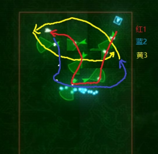 如果对方直升机在1、2两种位置,则走如下路线。