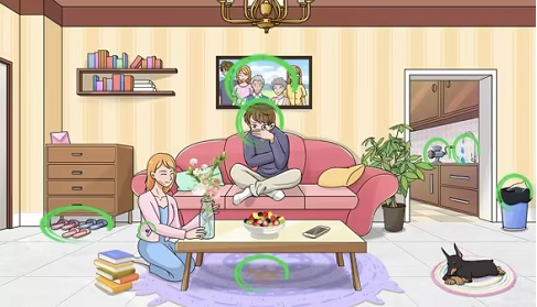 【隐藏胎记】拖动女子脸上的创可贴直到消失,点击女子即可,【警告信】:点击桌上的粉色信封,再点击信件即可,【聊天记录】:点击手机出现聊天记录,【本来面目】:其他十一个**找到后,打开聊天记录中的未接通消息,左边的【拖鞋】可以看出【屋内三人】,茶几下面是【剪掉的头发】;