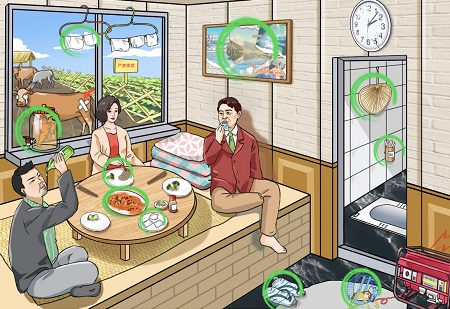 3、地上有【塑料瓶拖鞋】和【仓鼠发电】,桌子上是自家养殖的【鱼】和【奶盖甜品】,窗台上放着【胡萝卜】泡酒,衣架上面的【抹布】重复利用,后面的【画】是拼接的,厕所是用扇子去味的。