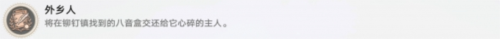 以上就是崩坏星穹铁道外乡人成就的完成攻略了,这个成就需要我们先去柳钉镇击败次元扑满获得饰有铃铛的肮脏缎带,之后再去特定位置进行交互,**就能获得八音盒了,之后交给NPC就能完成,希望本文能帮助到大家。