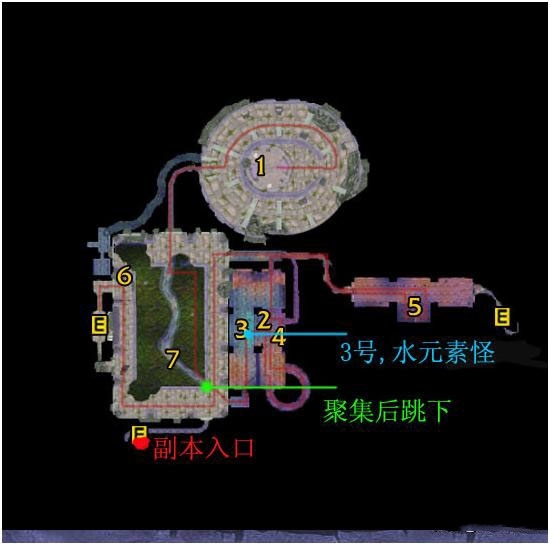 从左边“E”的位置进东区,在“6”的上面的缺口跳下,沿墙走到“3”下面的小房间,把水元素引来打了。