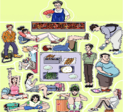 1、首先将拿扇子的人放到烤炉上方,灰色衣服弯腰的人放在右上角,下面放蓝色衣服大肚子的人,左边一长条放绿色条纹衣服的人;