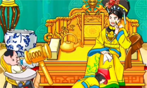 8、将剪刀拖动至皇帝的龙袍,**玉玺,再将玉玺拖动给婴儿,点击获得黄金奶瓶;