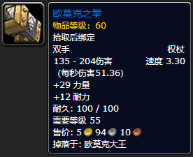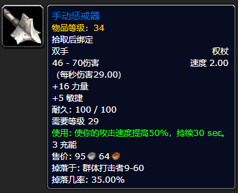 诺莫瑞根出品。别看这是30多级副本掉的蓝装,但这是第二件和野德“绑定”的武器,16力量和5敏捷属性不错,并且有**强力的**。因为之前说过,野德的伤害在怀旧服与武器伤害无关,所以这把武器将会陪伴野德度过几乎整个60级时代。属于消耗品,你要不停去诺莫瑞根刷这玩意儿。