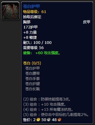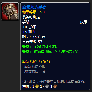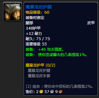 制皮制造。虽然没**量和敏捷,但攻强 暴击率的组合也还算不错,两件套的效果是 2%命中,值得一出。