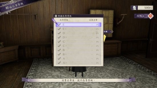 然后是指导**,一等,500Pt,我上一次有玩到A ,所以一开始就把名声都all in,进去了,**次散步就已经有很多步数可以用加速你升能力、好感的进度。