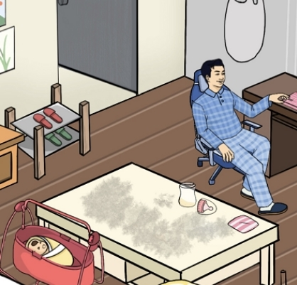 5、把床头柜上的水壶拖到奶瓶处,冲好奶粉并喂给婴儿,把阿强拖到床上照顾婴儿,**用抹布把桌子擦干净即可完成通关。