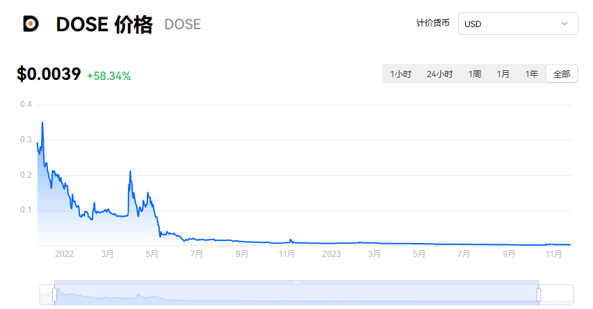 24小时**/**价24小时**$0.0025 **价格 $0.0039 24小时**$0.0045 热度排行 19 市值排行 1541 市值 $524.95万 添加自选人数 (百分比) 0.70% 历史**价 $0.50 -99.23% (-$0.49) 2021年11月3日 (3 年前) 历史**价 $0.0013 205.25% ( $0.0027) 2023年10月19日 (3 月前) **发行时间 2021/11/03 **发行价 $0.030 流通总量 13.55亿 DOSE 流通市值 $524.95万