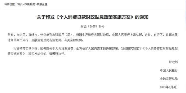 通知显示,为贯彻落实党**和**院关于大力提振消费、全方位扩大**需求的决策部署,根据**办公厅、**院办公厅印发的《提振消费专项行动方案》关于2025年对符合条件的个人消费**给予财政贴息的要求,更好发挥财政资金对提振消费的支持引导作用,**居民消费信贷成本,助力释放居民消费潜力,促进经济加快向好发展,制定本实施方案。