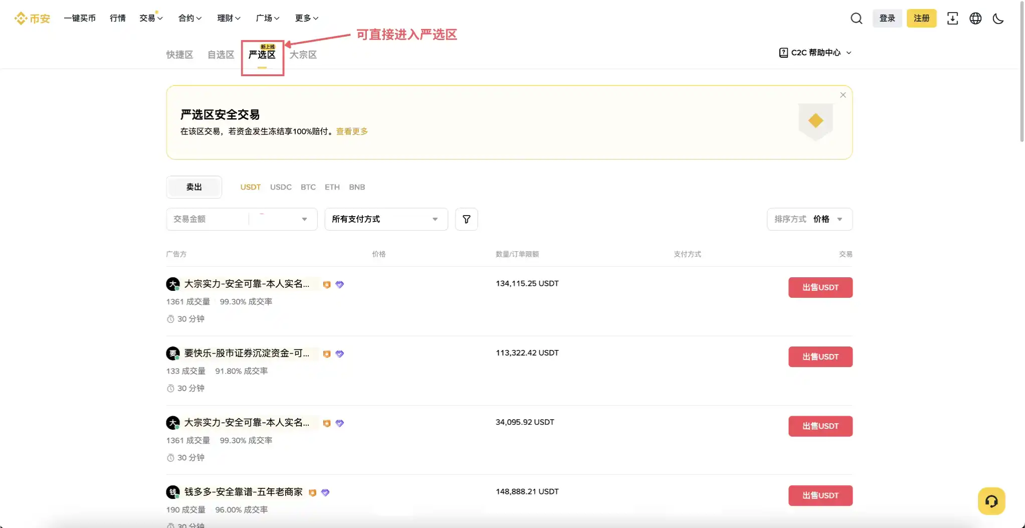 在此框架下,Binance C2C 持续迭代,在原有神盾商家的基础上推出了 C2C 严选专区,将风险缓冲提前嵌入用户旅途:严选区也是从现有的神盾商家筛选出更优质的,让用户更加省心;用户在 C2C 严选区出金如果遇到**冻结将会获得 100%,上限 50,000 USDT 的赔付;