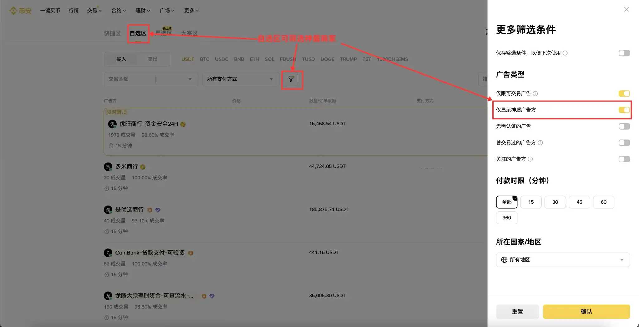 此外,为了方便用户选择,Binance 在 C2C 界面单独开了严选区,如果用户想要直接跟严选区的商家进行交易,使用网页端或者新版的 app 可以直接点击严选区而不需要在商家列表中多一步筛选商家的步骤。即使用户在非严选区交易,也可以选择大宗区或者自选区通过筛选找到神盾商家。